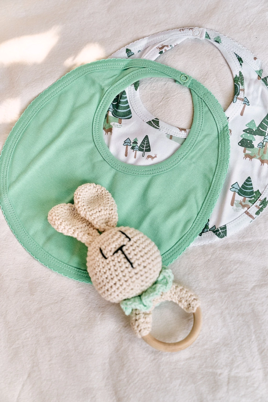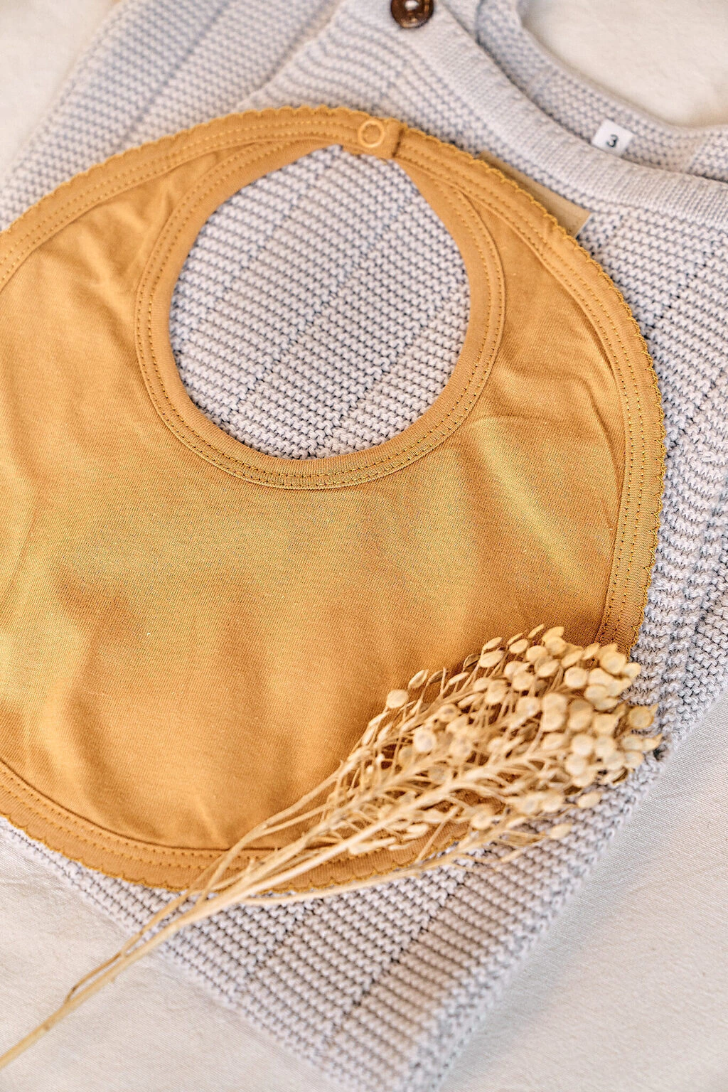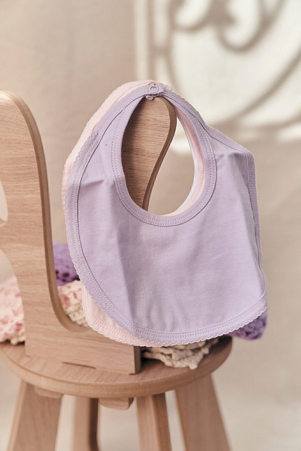 Babero de algodón con broche metálico. Borde con picot a tono.
