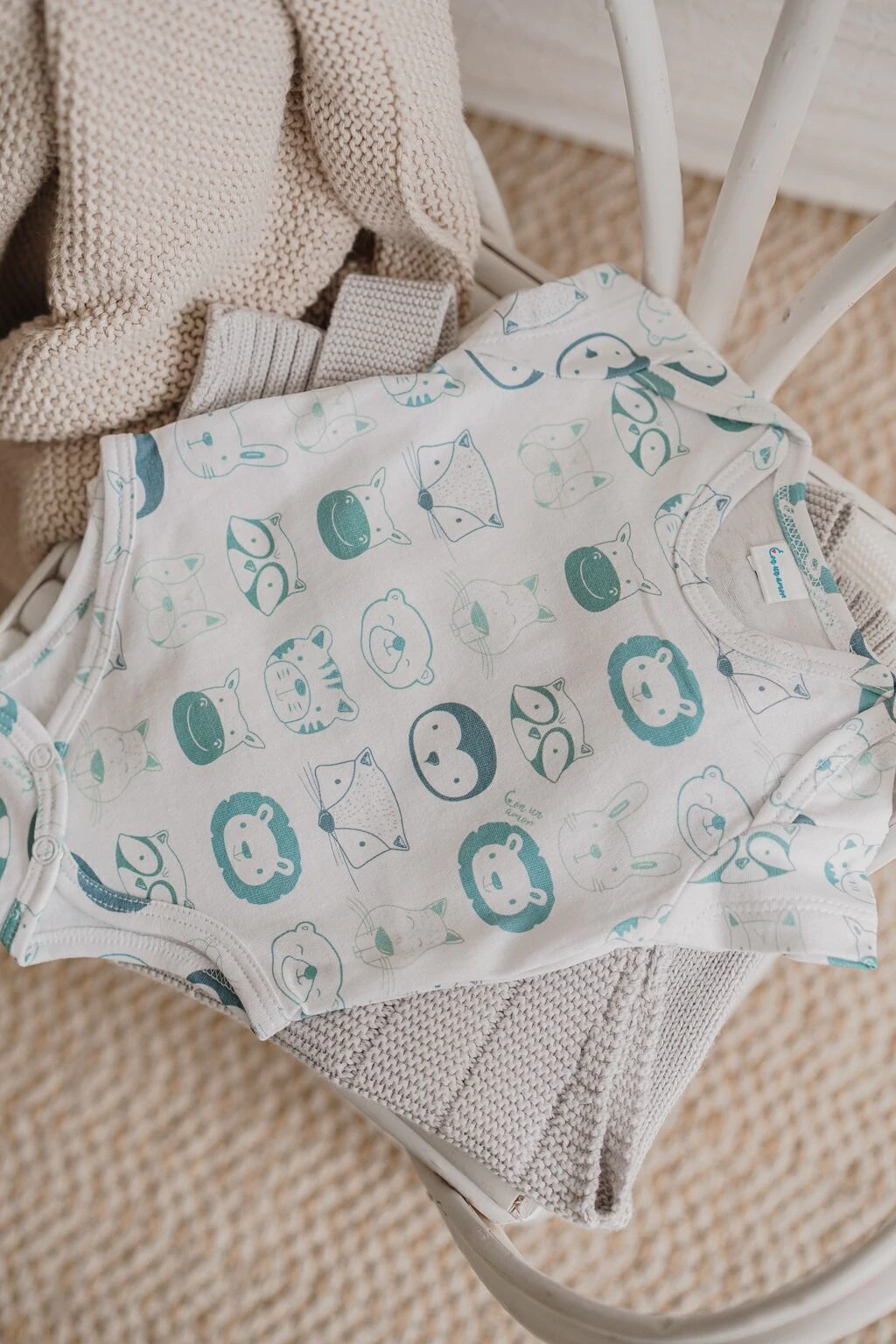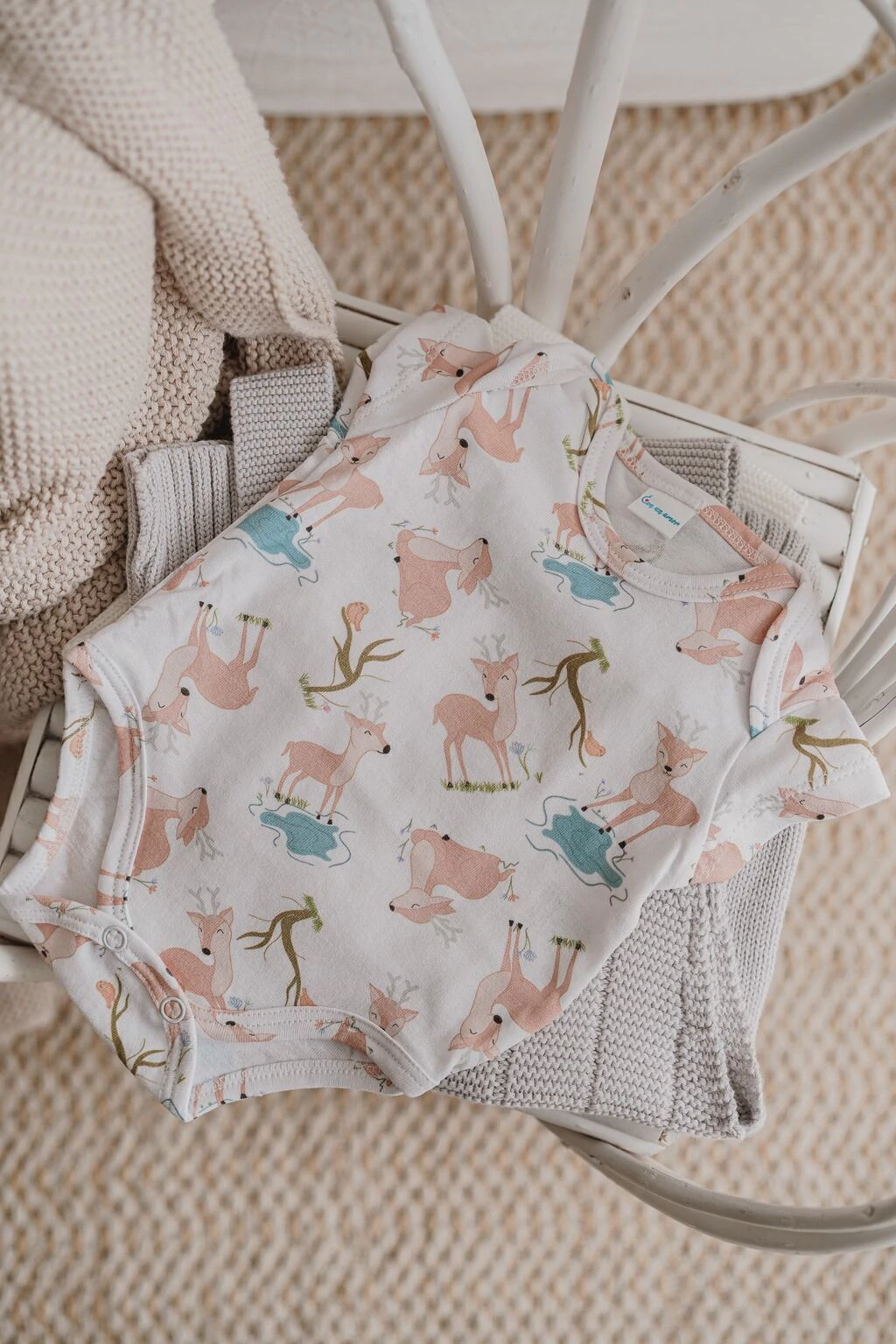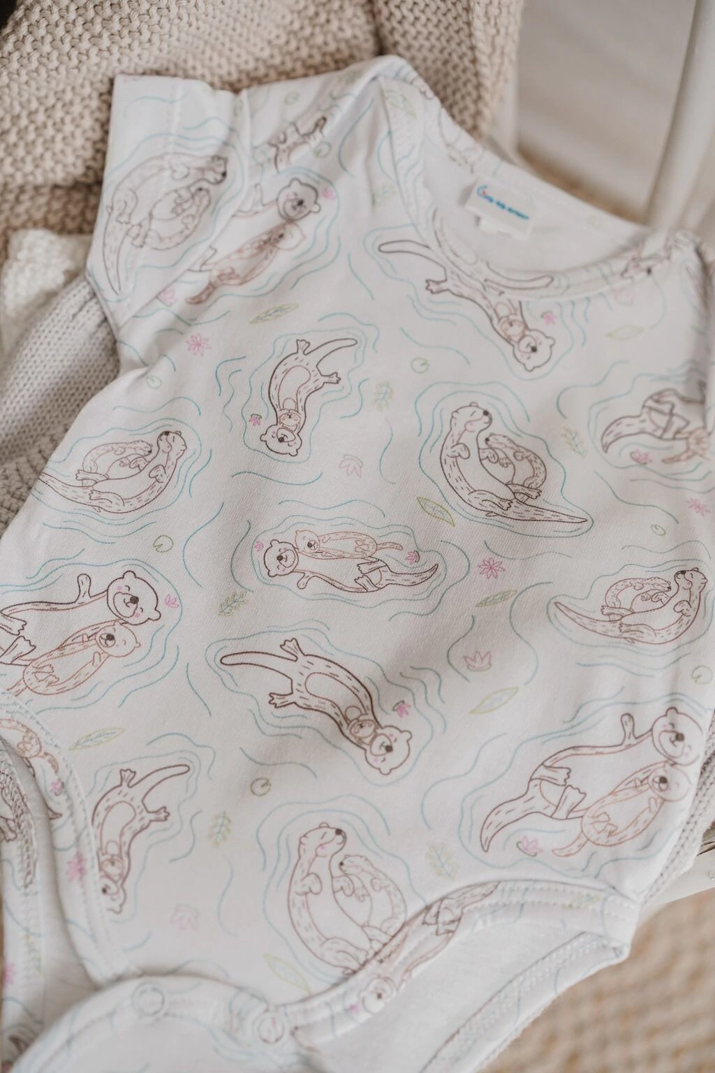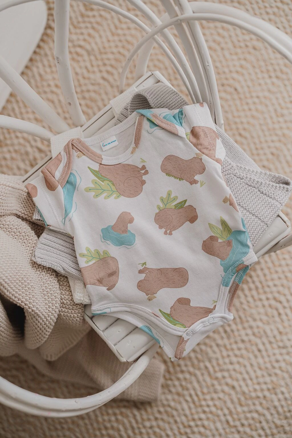 Body de algodón estampado manga corta, con cuello americano y 3 cierres metálicos en la entrepierna.
