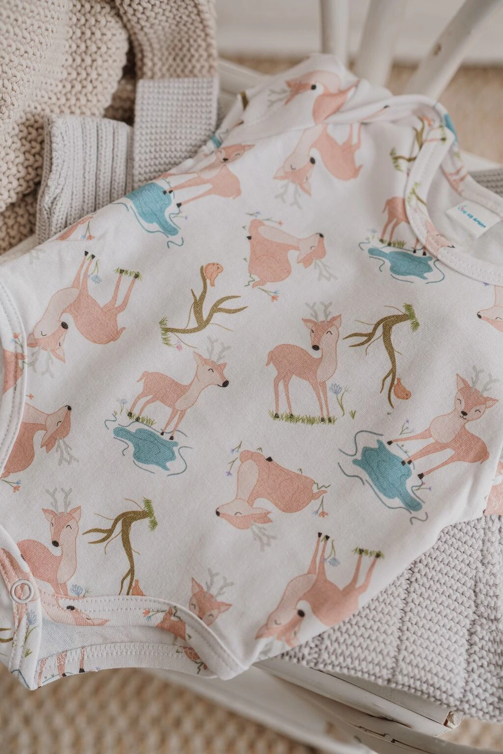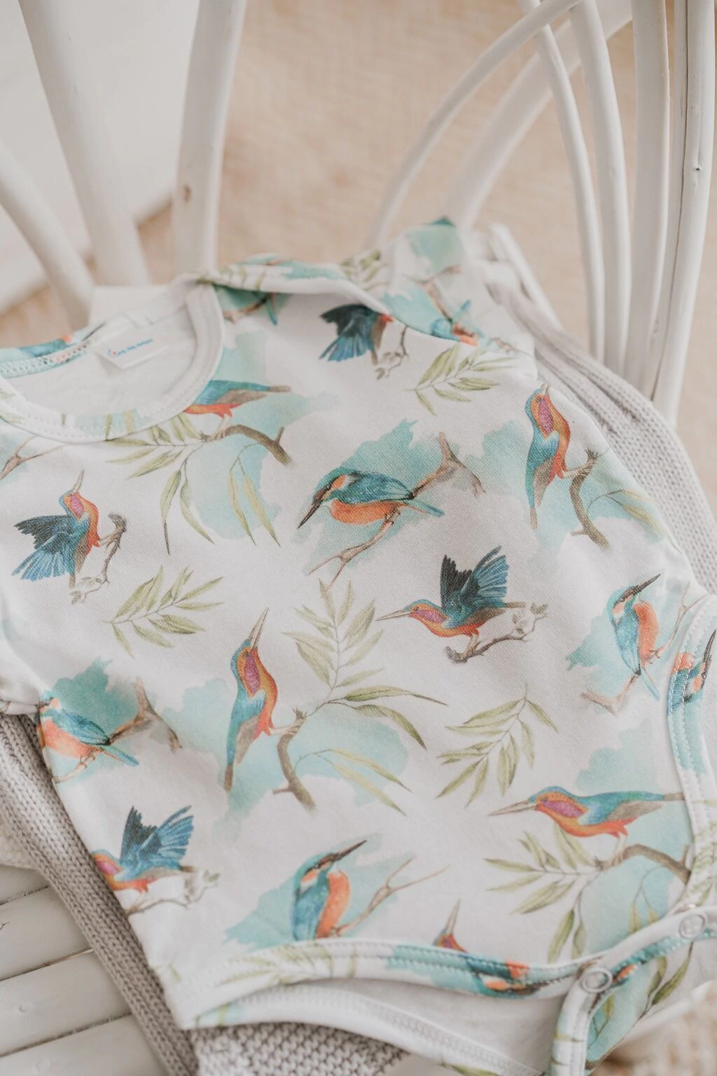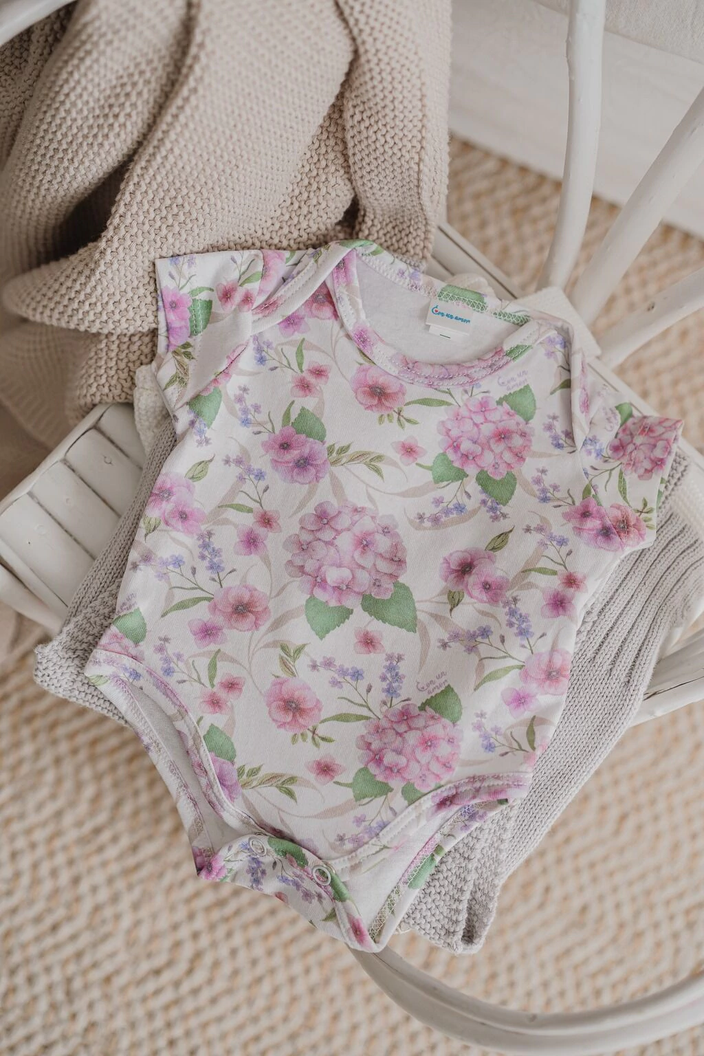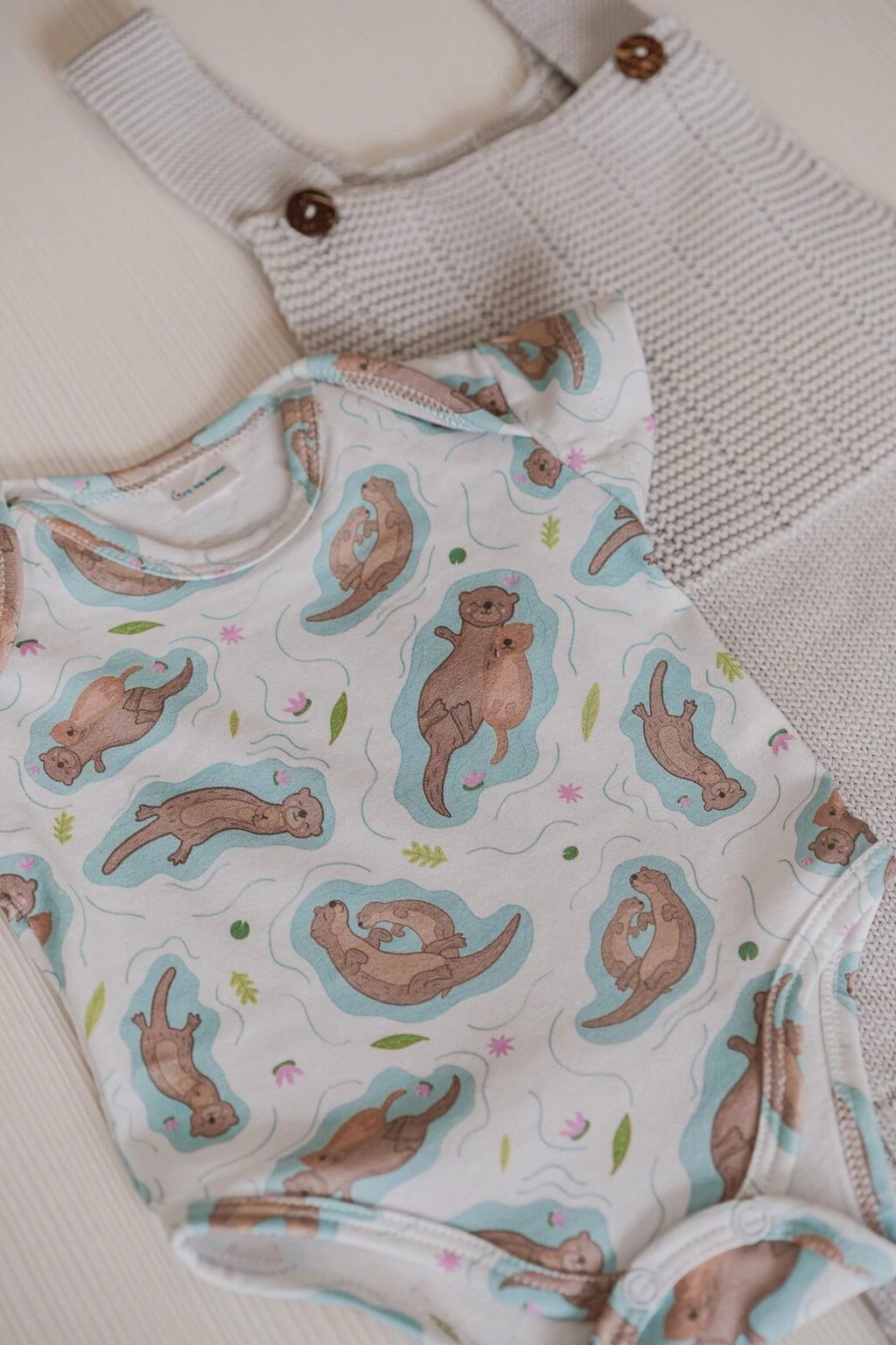 Body de algodón estampado manga corta, con cuello americano y 3 cierres metálicos en la entrepierna.