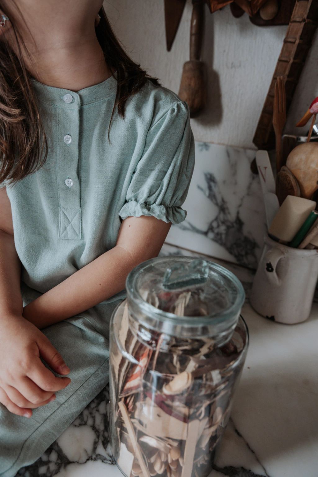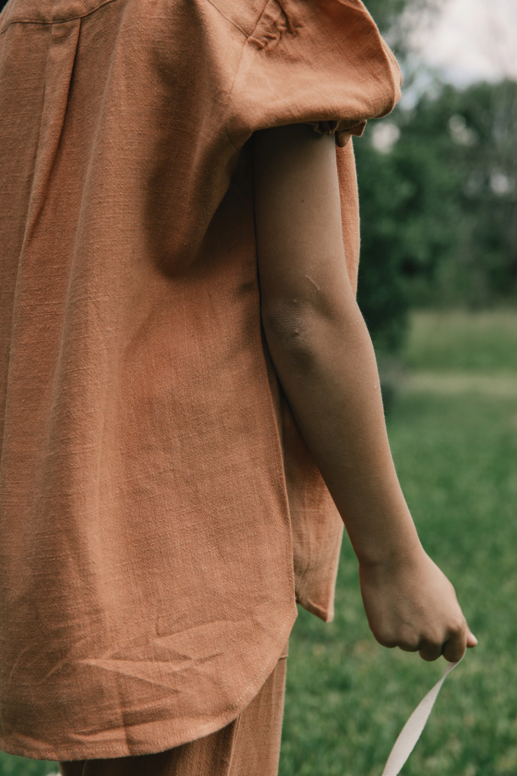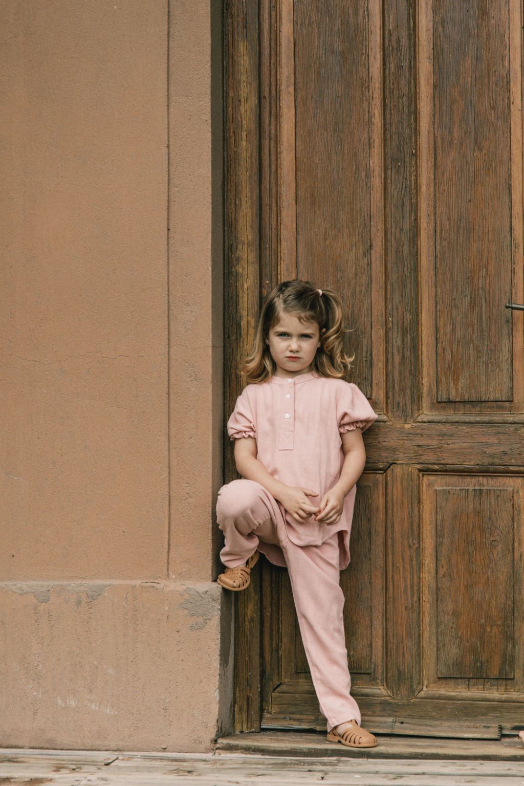 Fresca y cómoda, con mangas abullonadas con elástico y botones en el cuello, ideal para un look relajado y sofisticado a la vez.