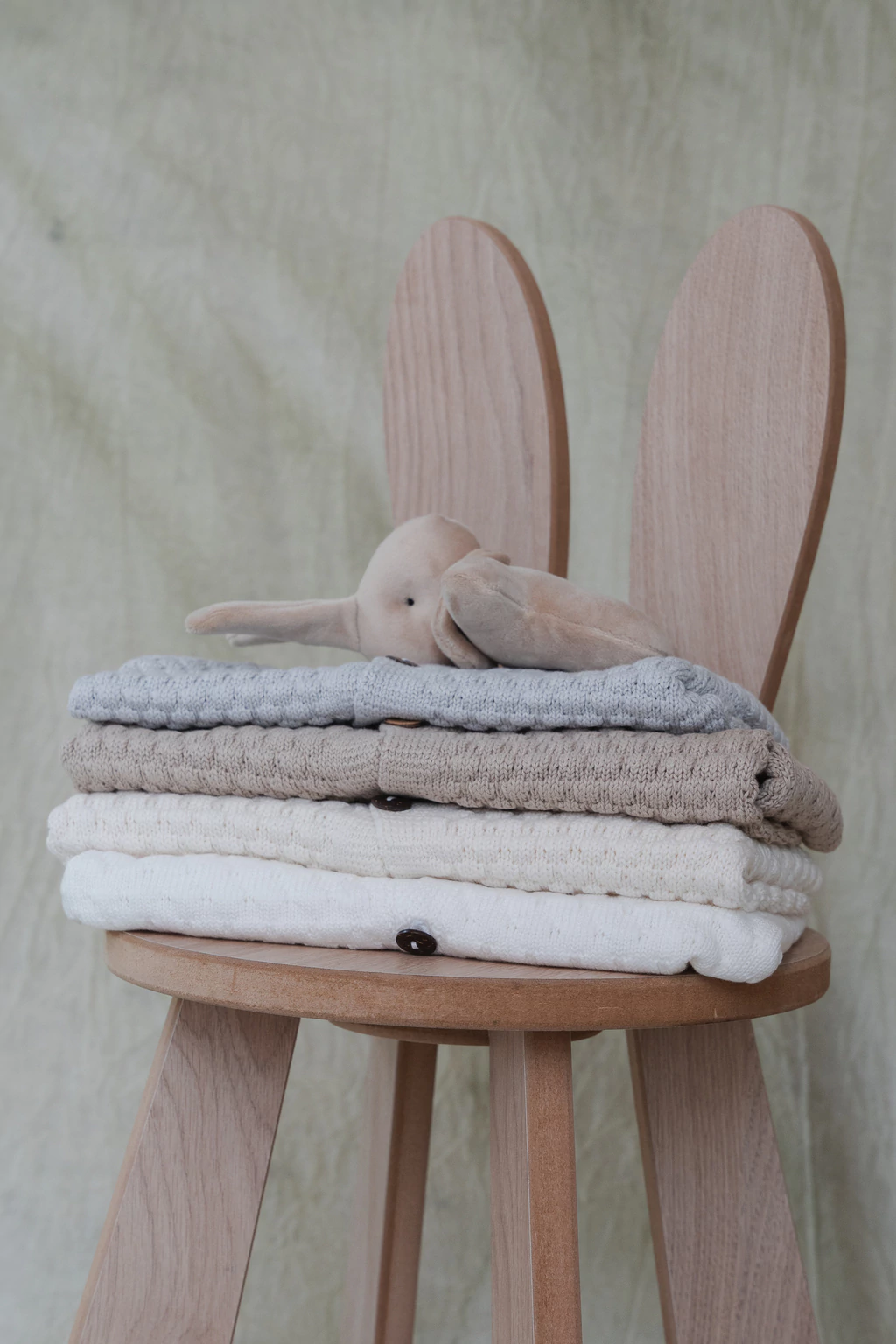 Cárdigan Split, ideal para tener calentito a tu bebé, super cómodo y versatil. Confeccionado con punto «pancitos». Su relieve y textura en su forma es ideal para ocasiones formales.