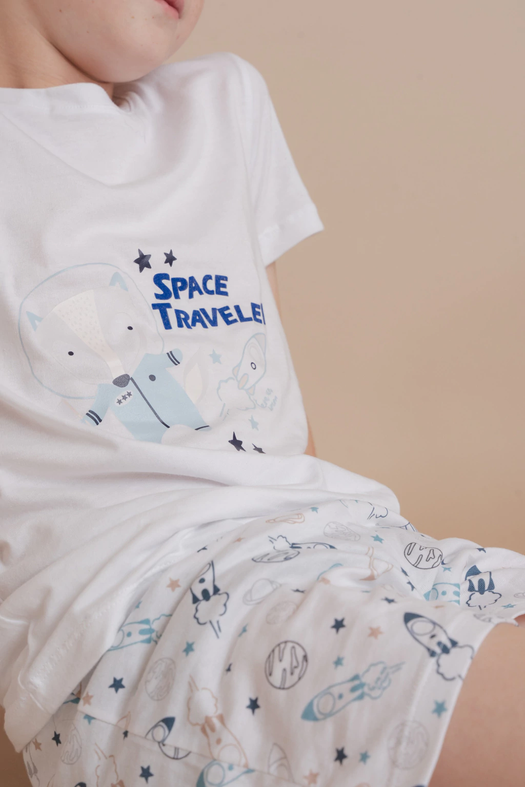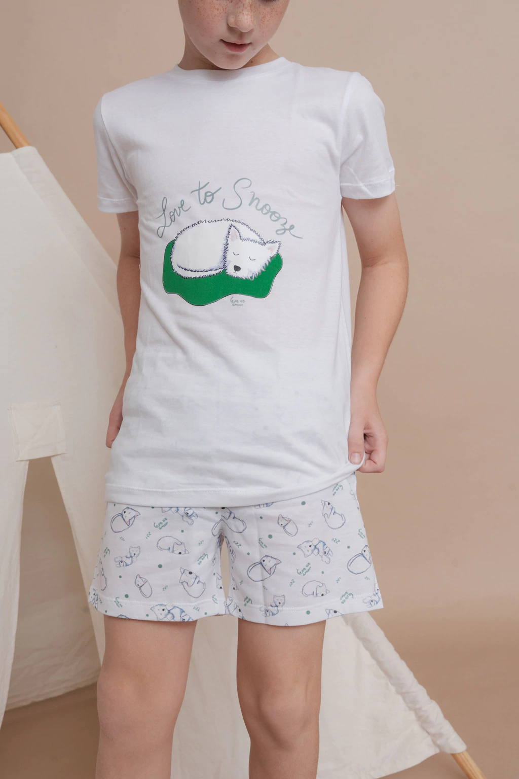 Pijama manga corta. Remera blanca con estampa y short estampado.