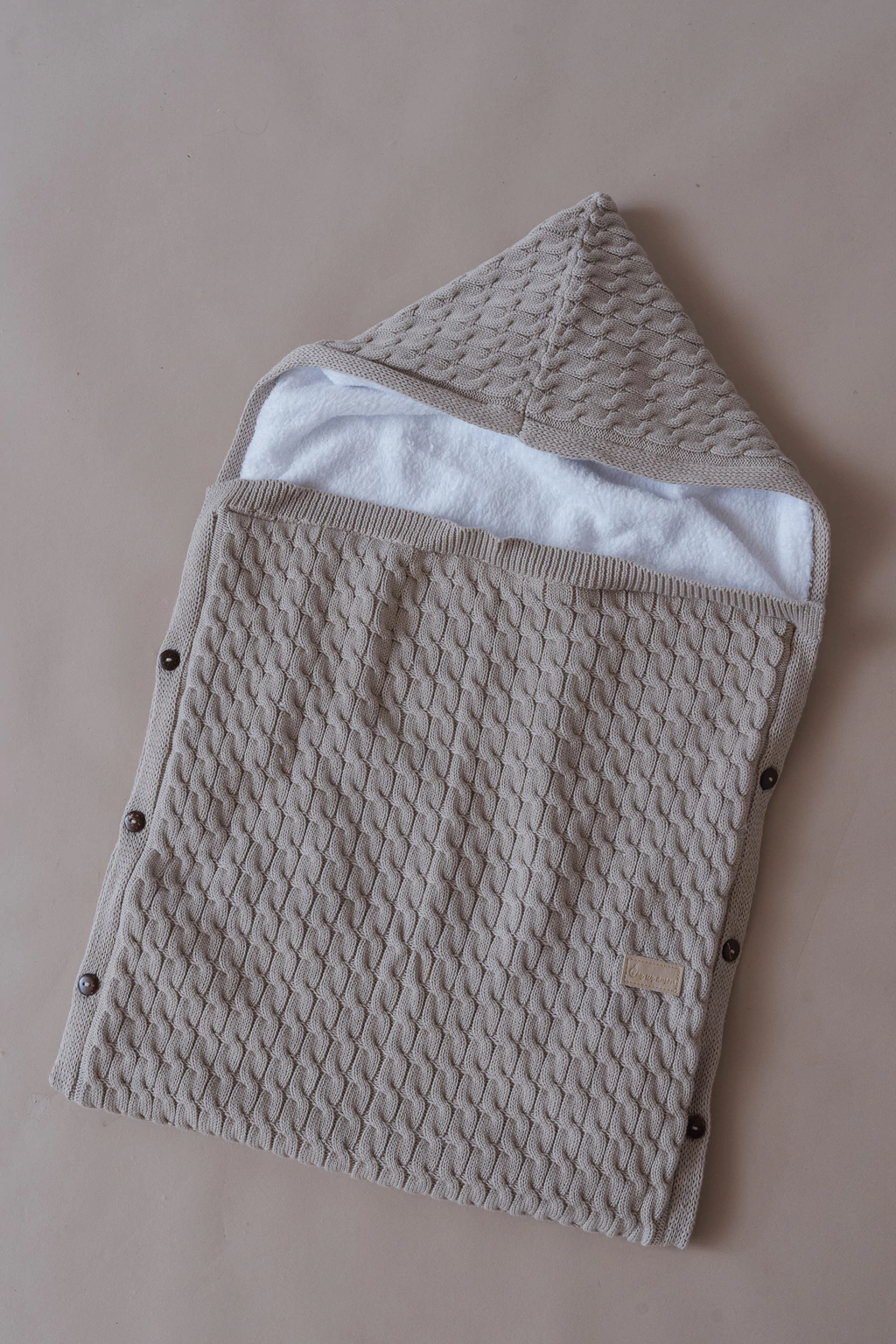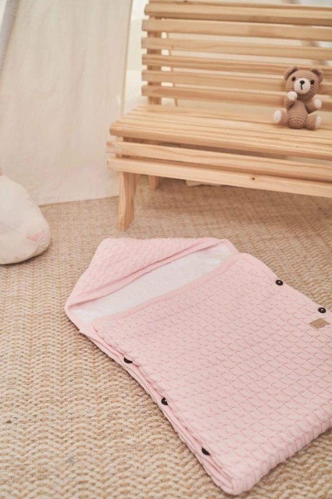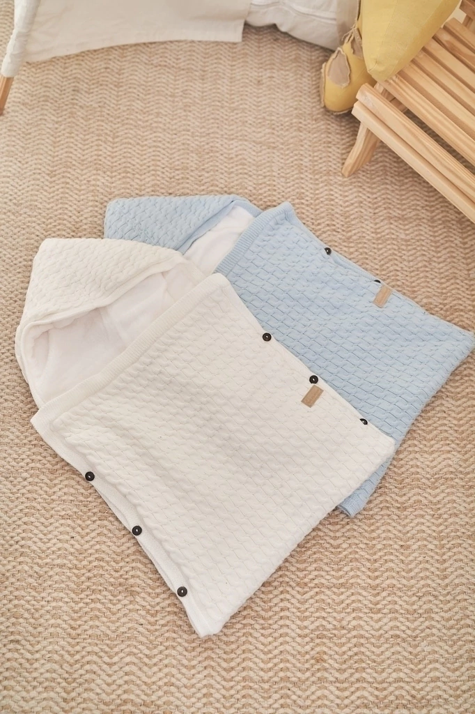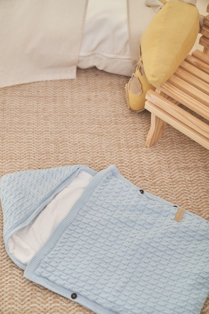 Tejido todo con “ochitos”. Tiene corderito importado de la mejor calidad. Súper suave y abrigado. Opción práctica, pensado para que el bebé vaya tranquilo, relajado y contenido.