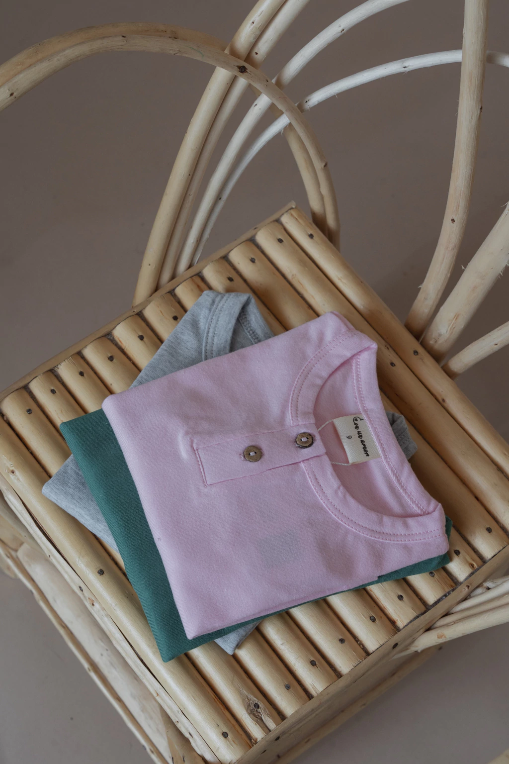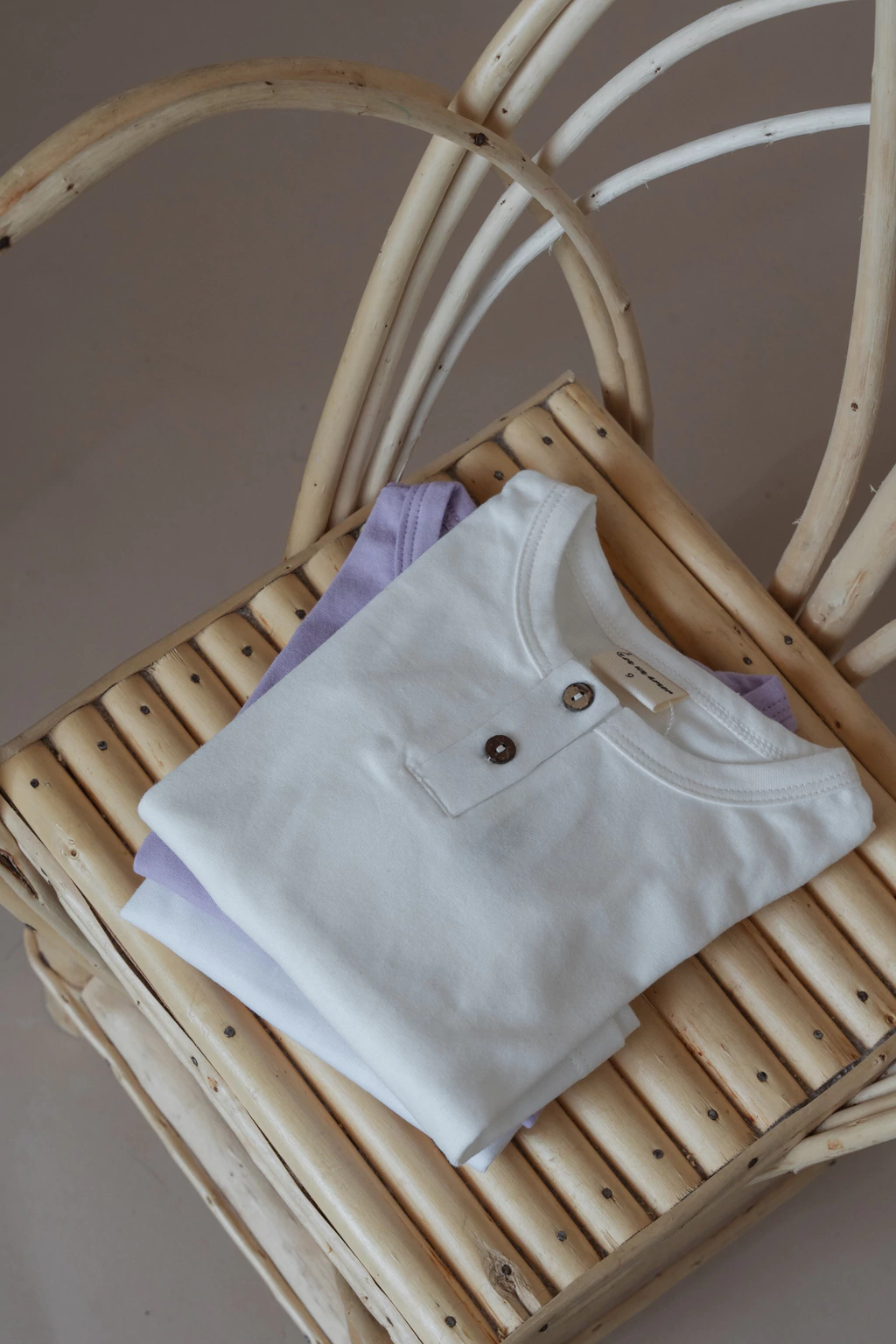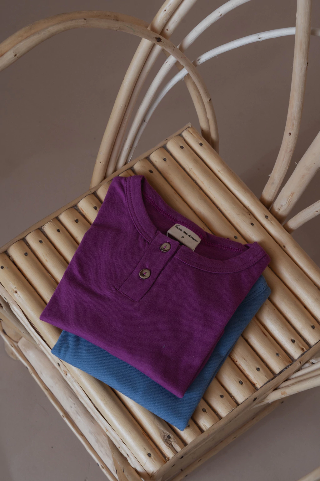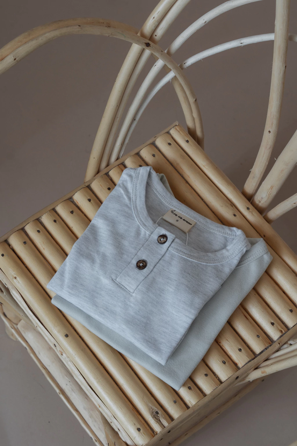 Remera manga larga con cuello redondo y cartera con dos botones de madera.