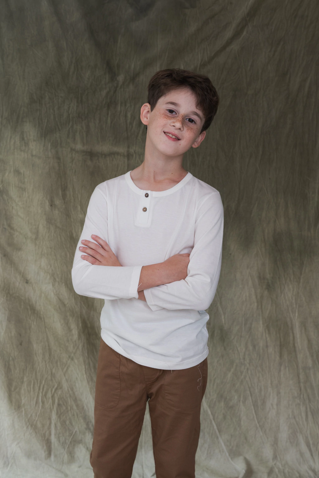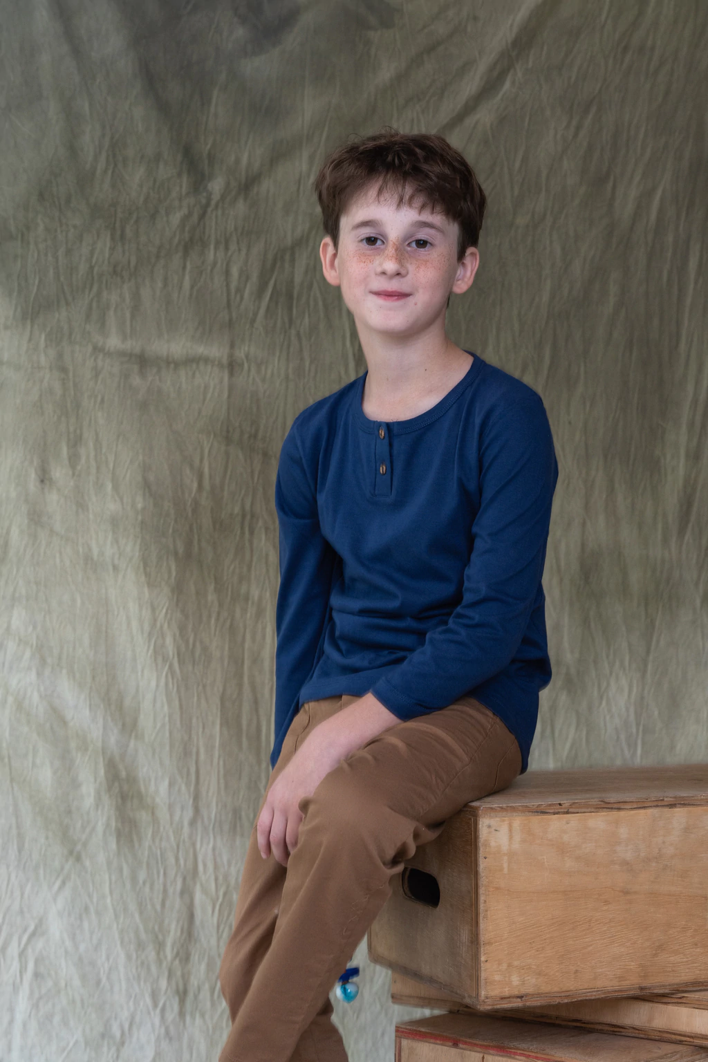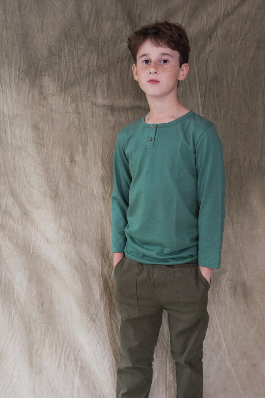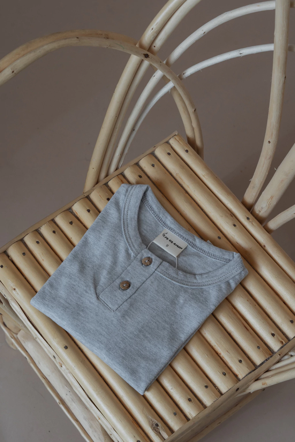 Remera manga larga con cuello redondo y cartera con dos botones de madera.