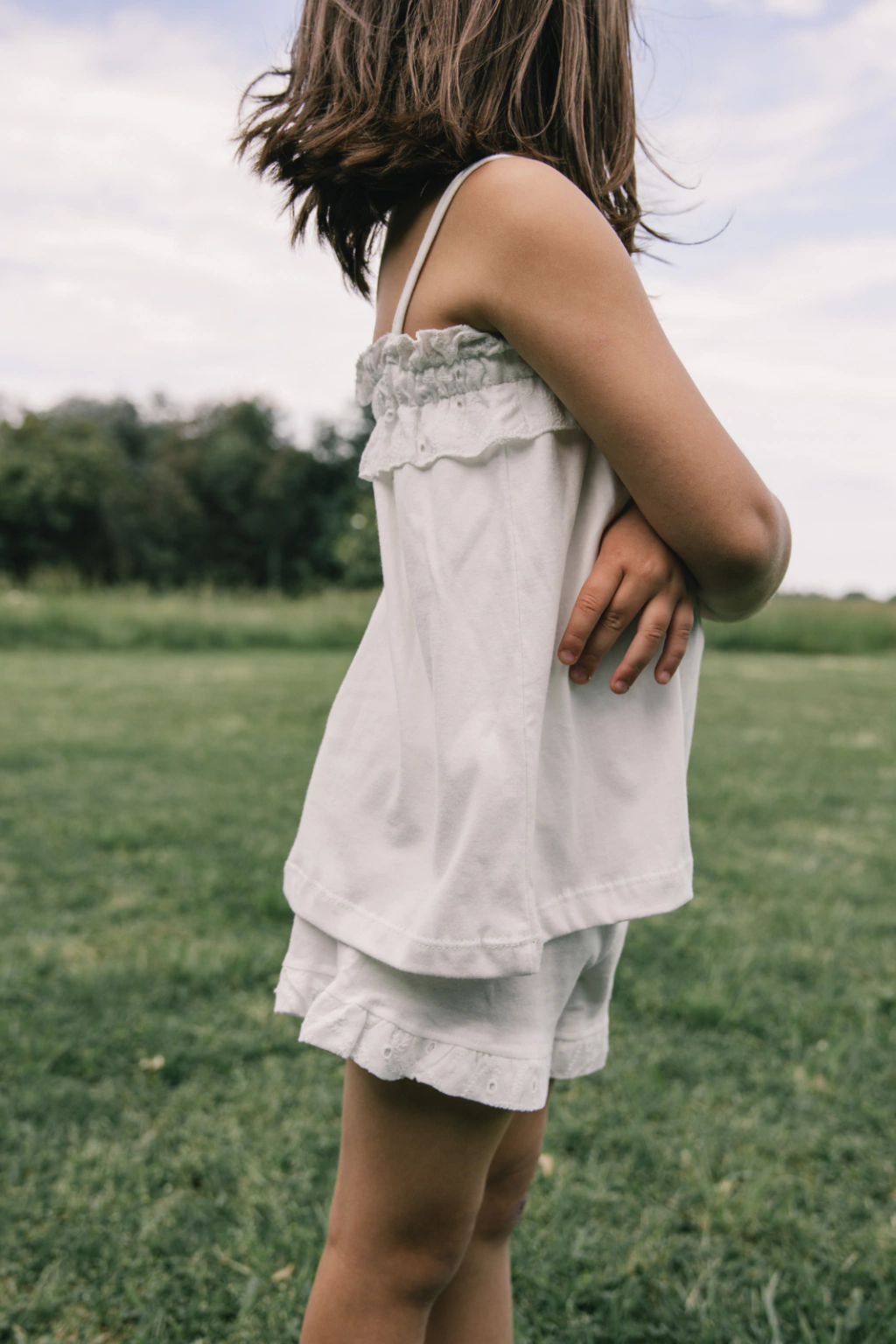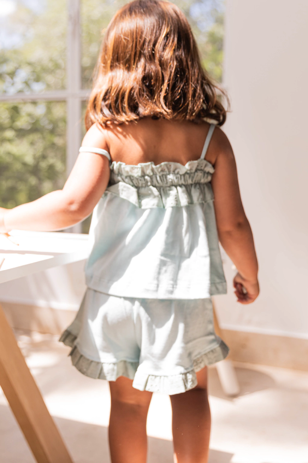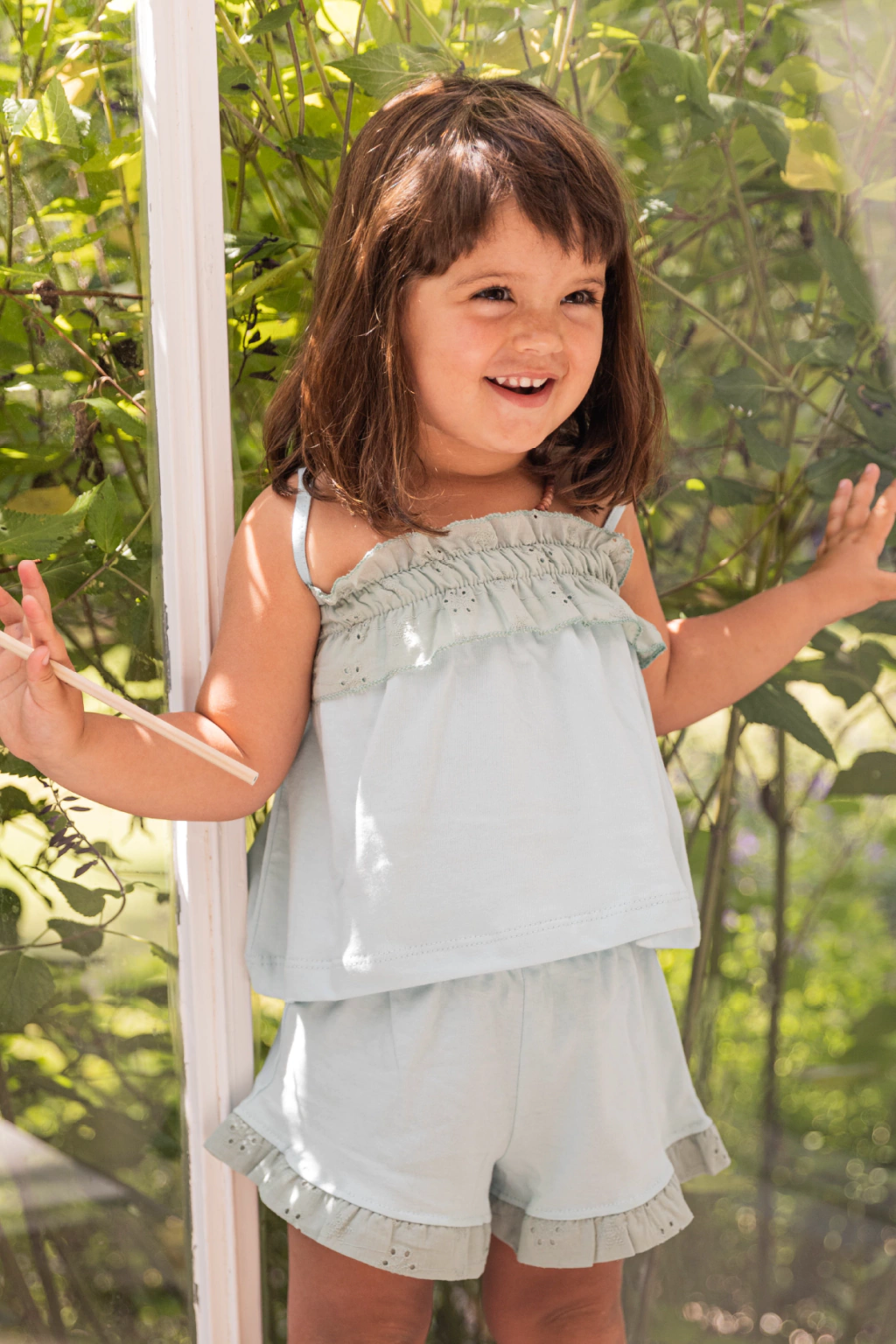 Short con cintura elástica confeccionado en suave algodón, con un delicado diseño y un volado en broderie que le da movimiento y encanto.