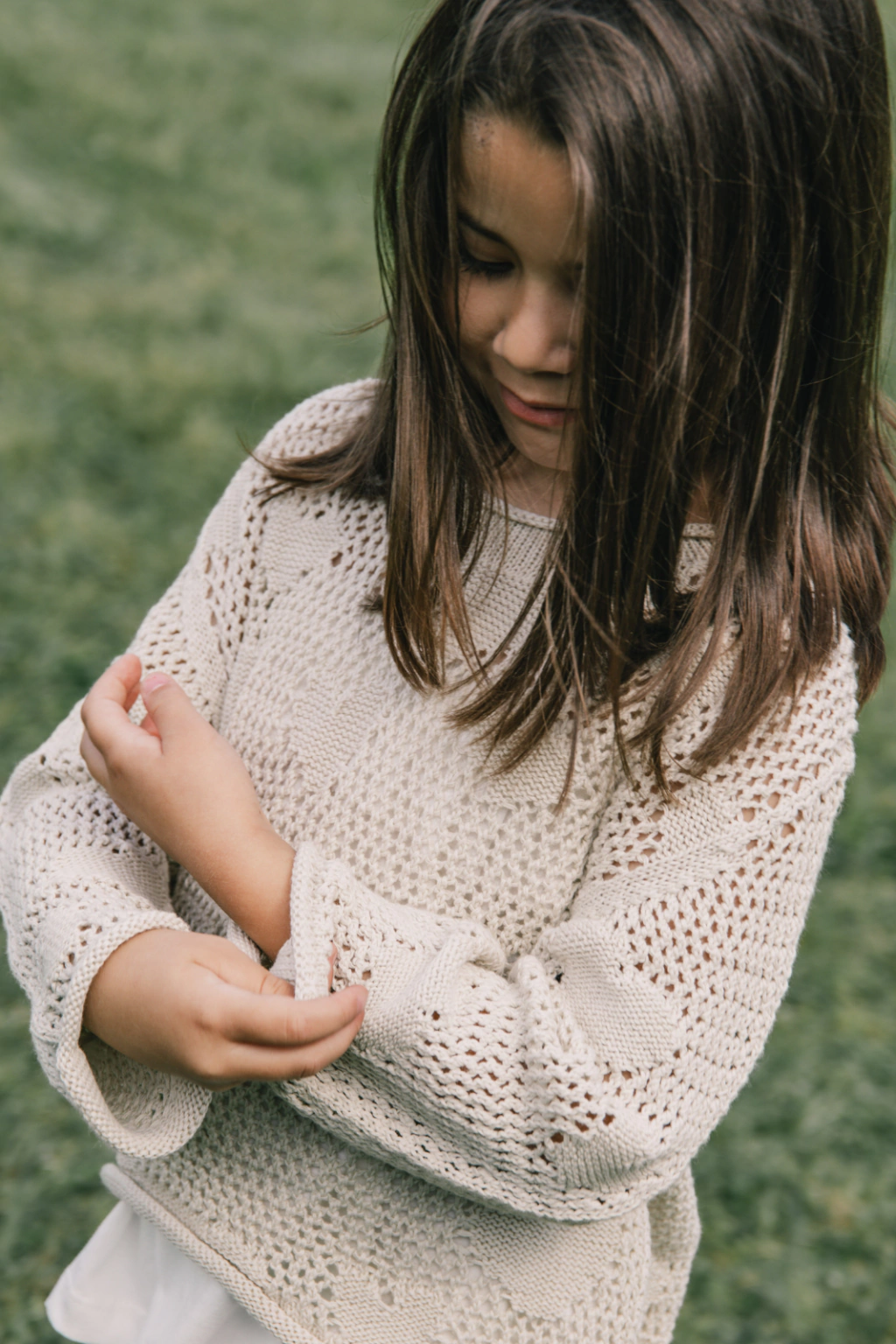 Sweater de niña en punto calado con dibujos de corazones, perfecto para sumar un toque tierno y cómodo a cualquier look.