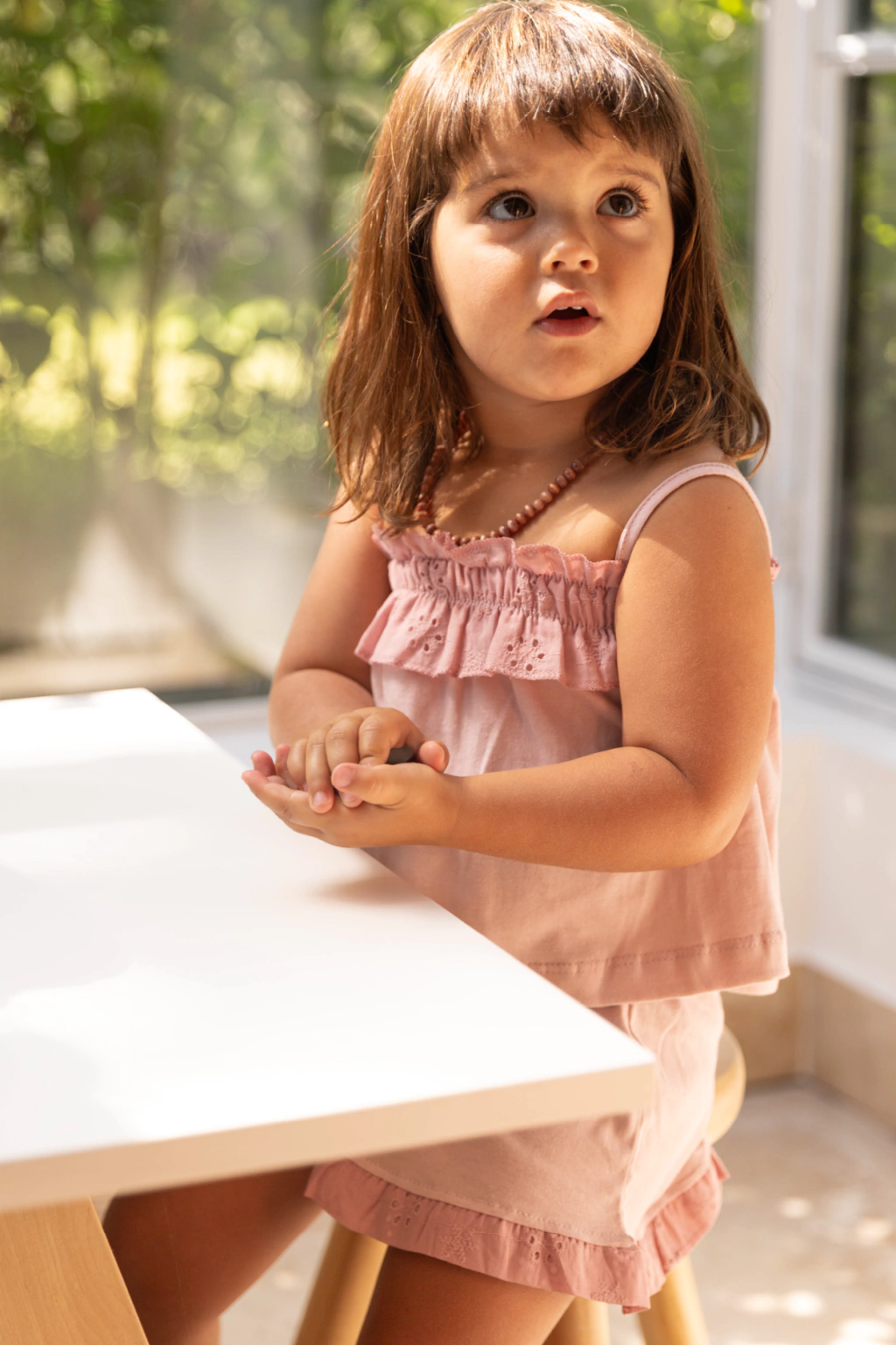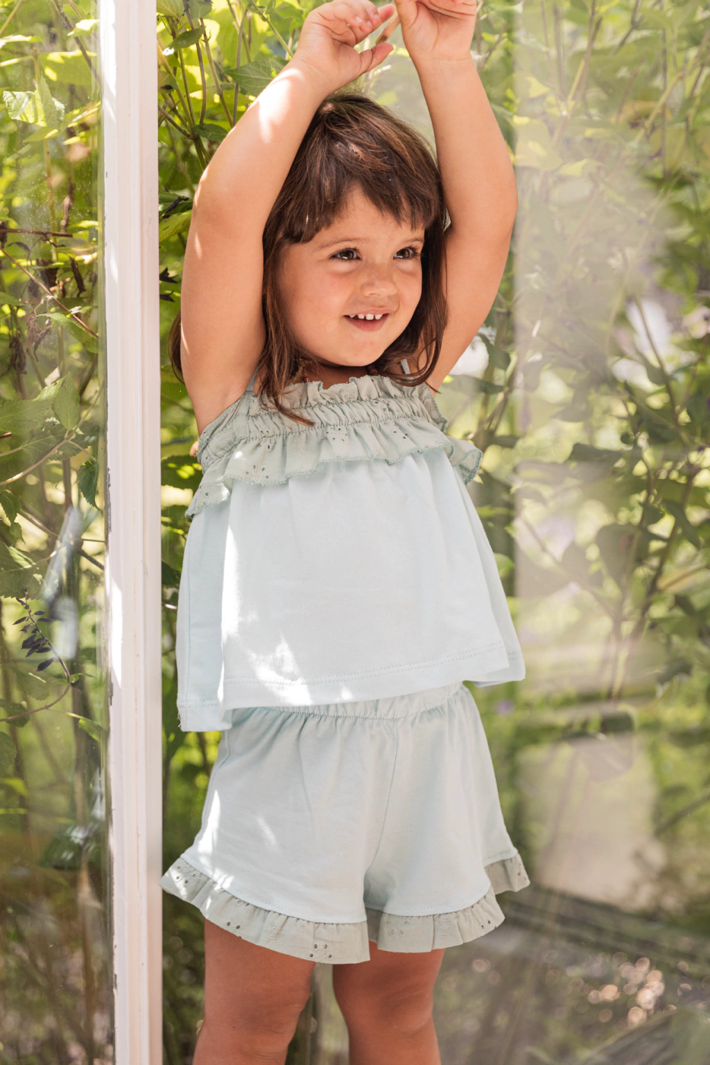 Delicada y fresca, esta blusa con volado de broderie y breteles es perfecta para las más chiquitas. Confeccionada en algodón 100%, es un ítem super cómodo, liviano y versátil para usar esta temporada.