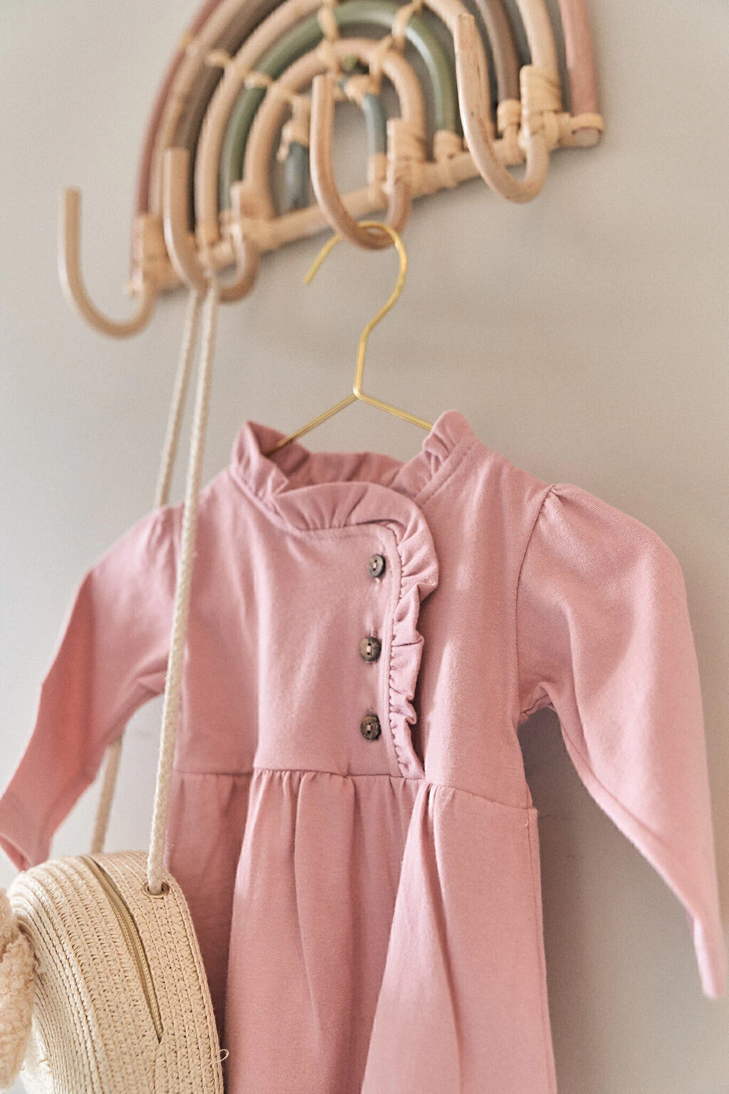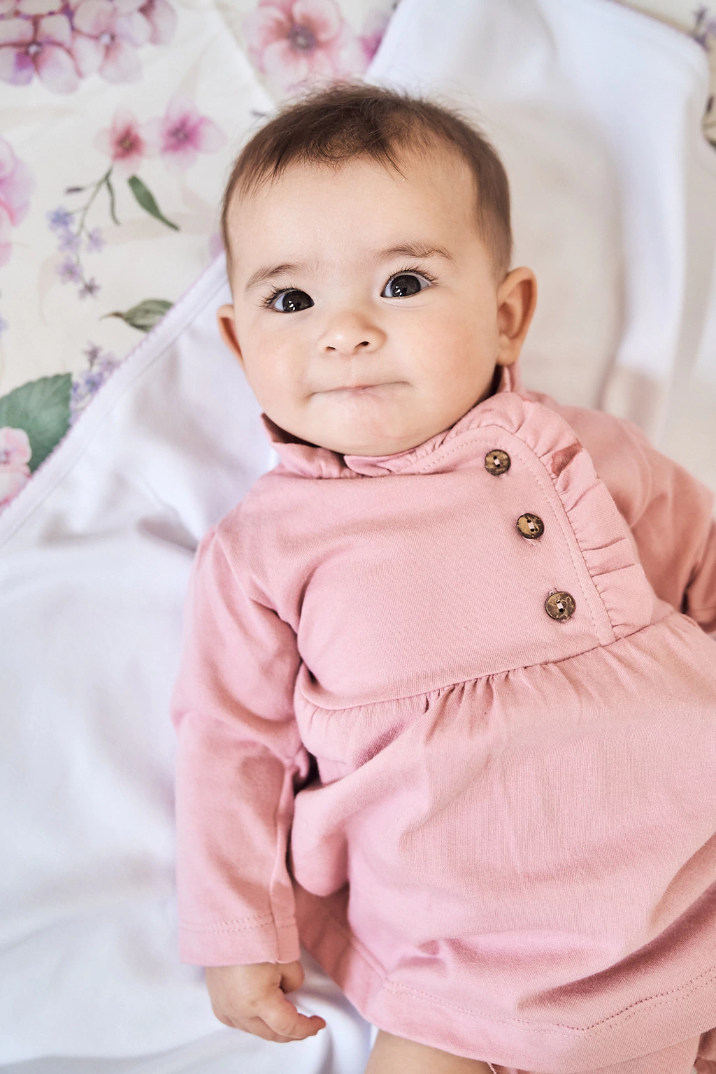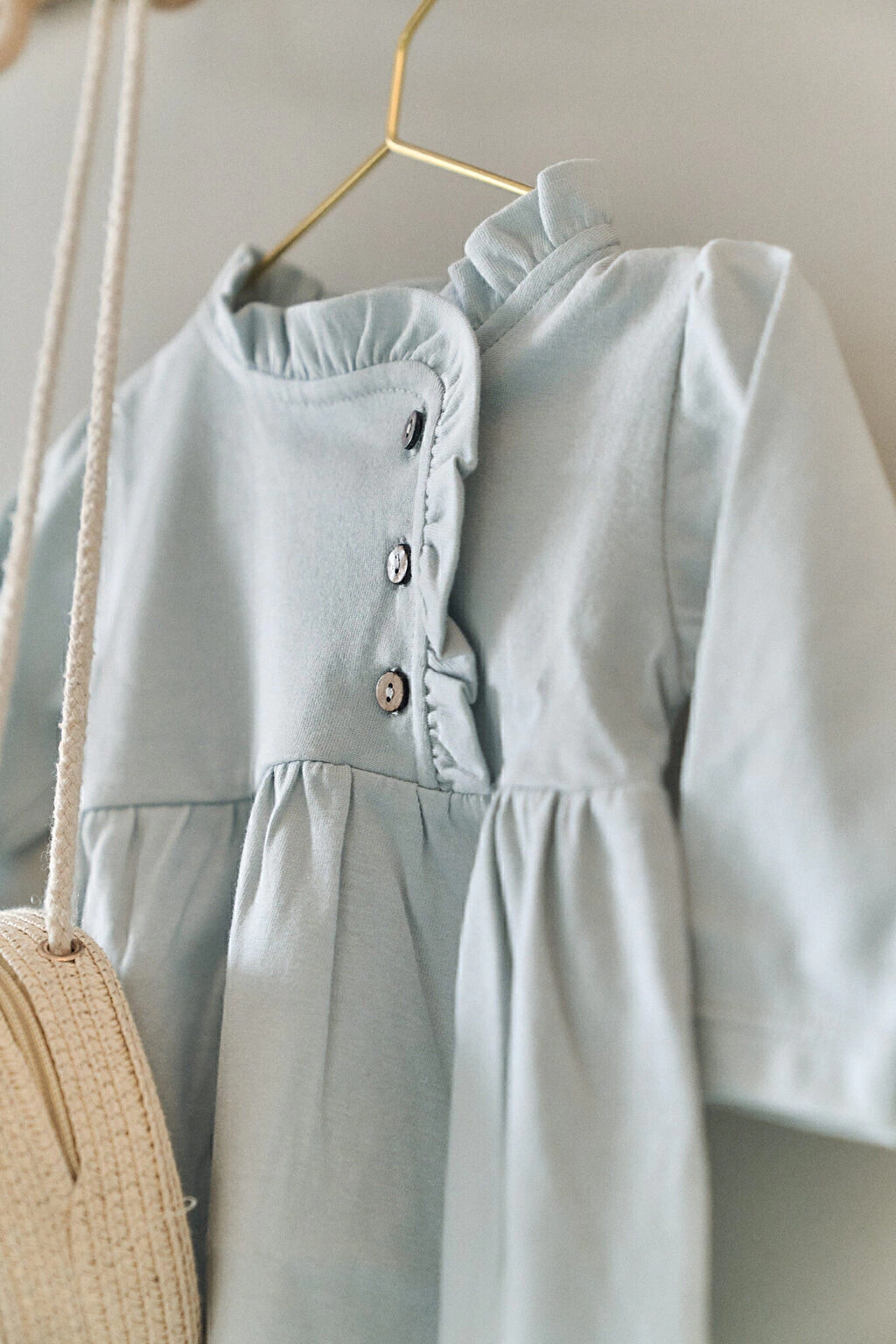 Vestido manga larga liso, con cuello cruzado con 3 botones. Volado en contorno de cuello y abertura. Incluye bombachudo de la misma estampa.