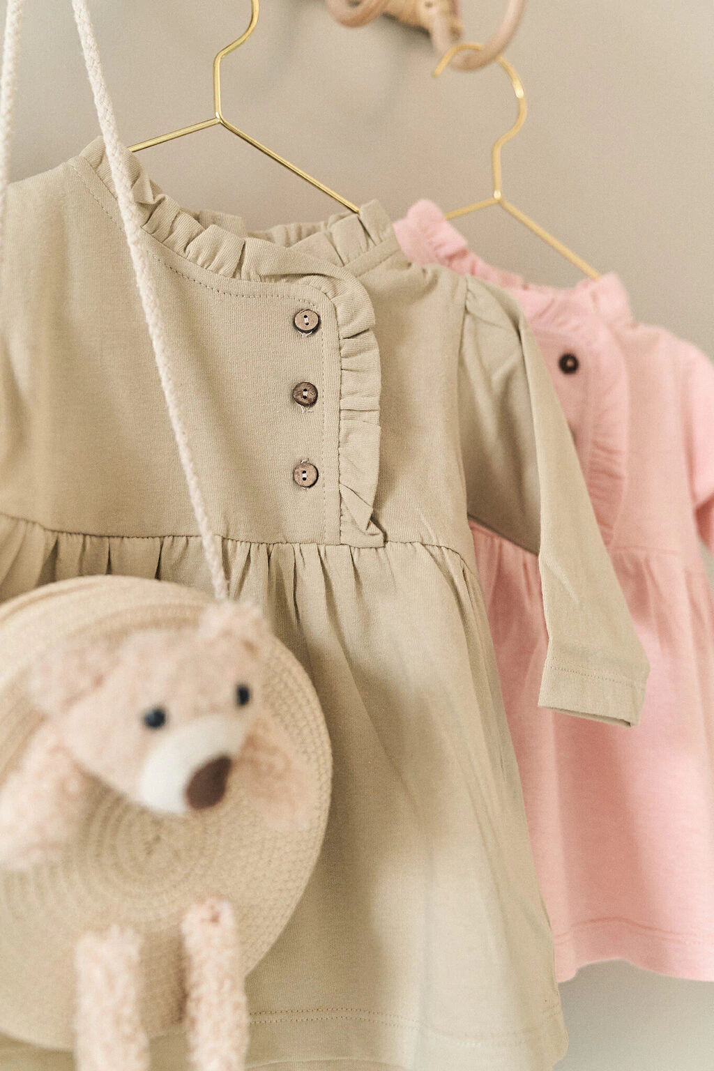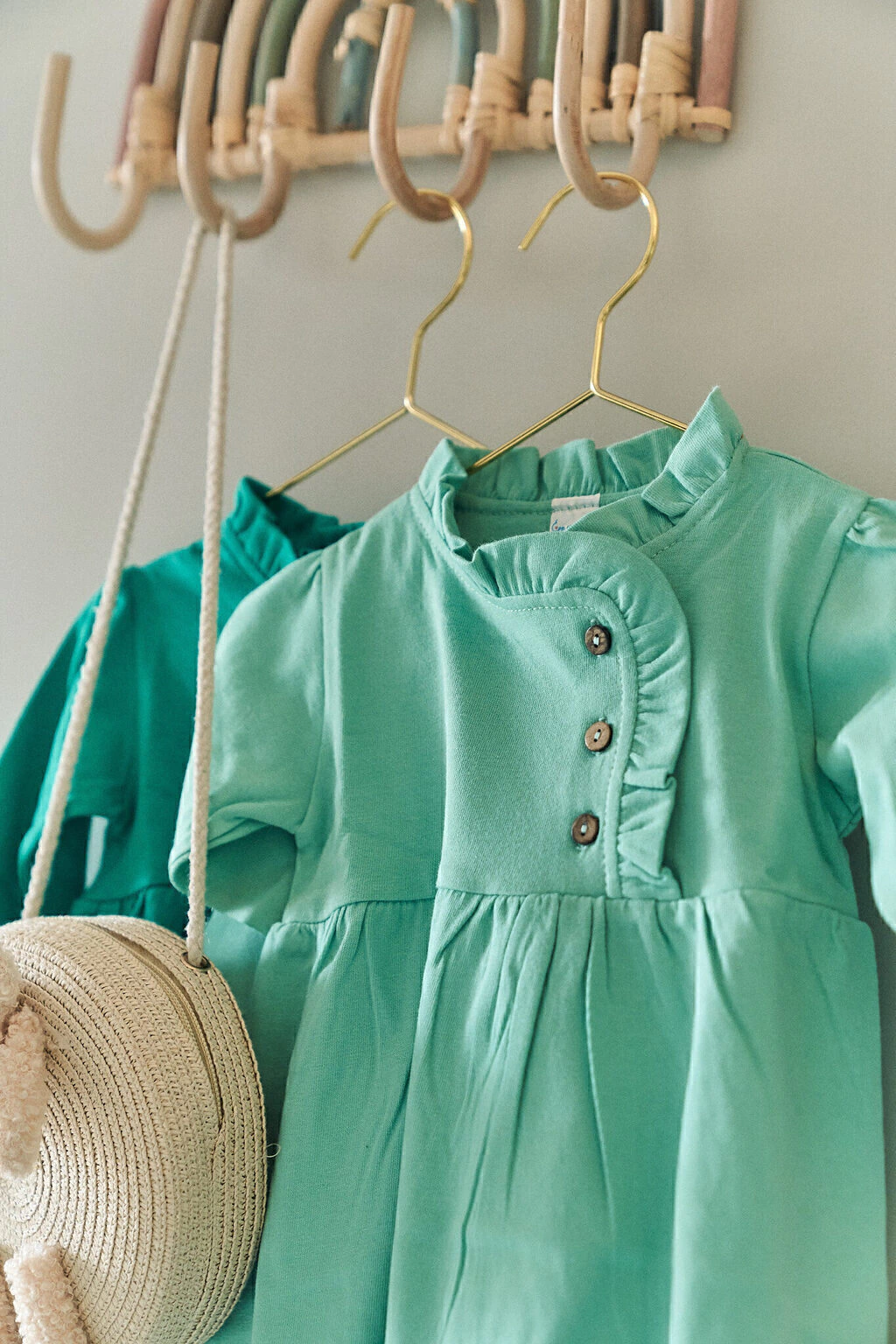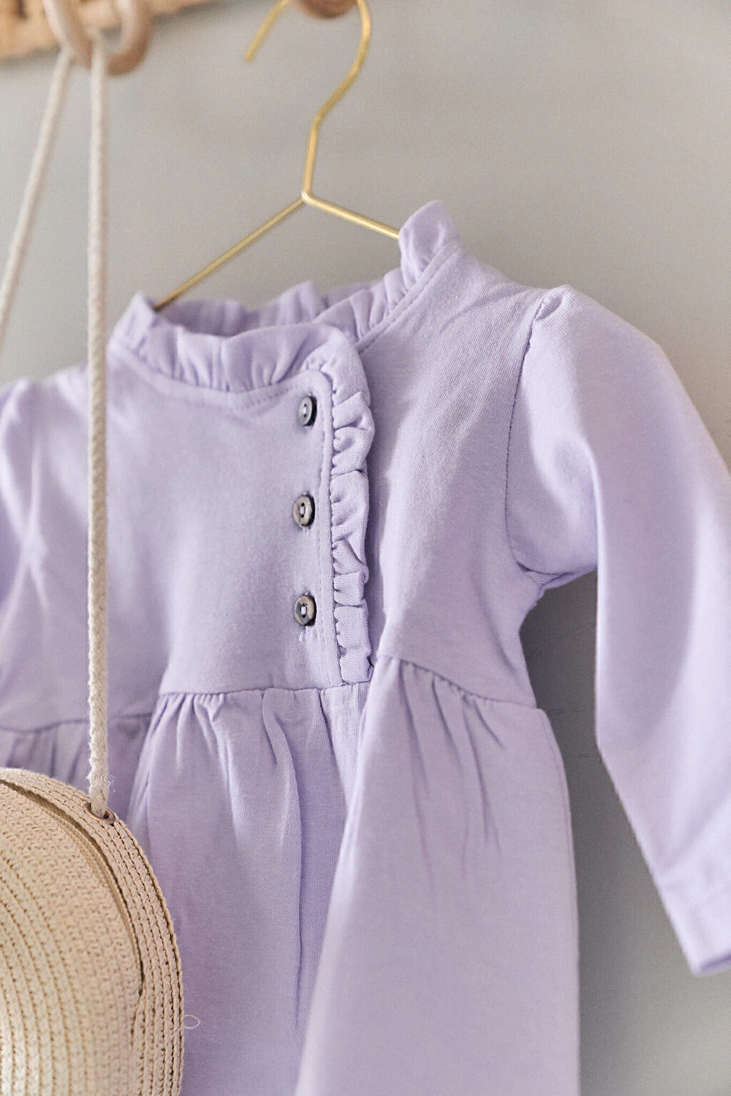 Vestido manga larga liso, con cuello cruzado con 3 botones. Volado en contorno de cuello y abertura. Incluye bombachudo de la misma estampa.