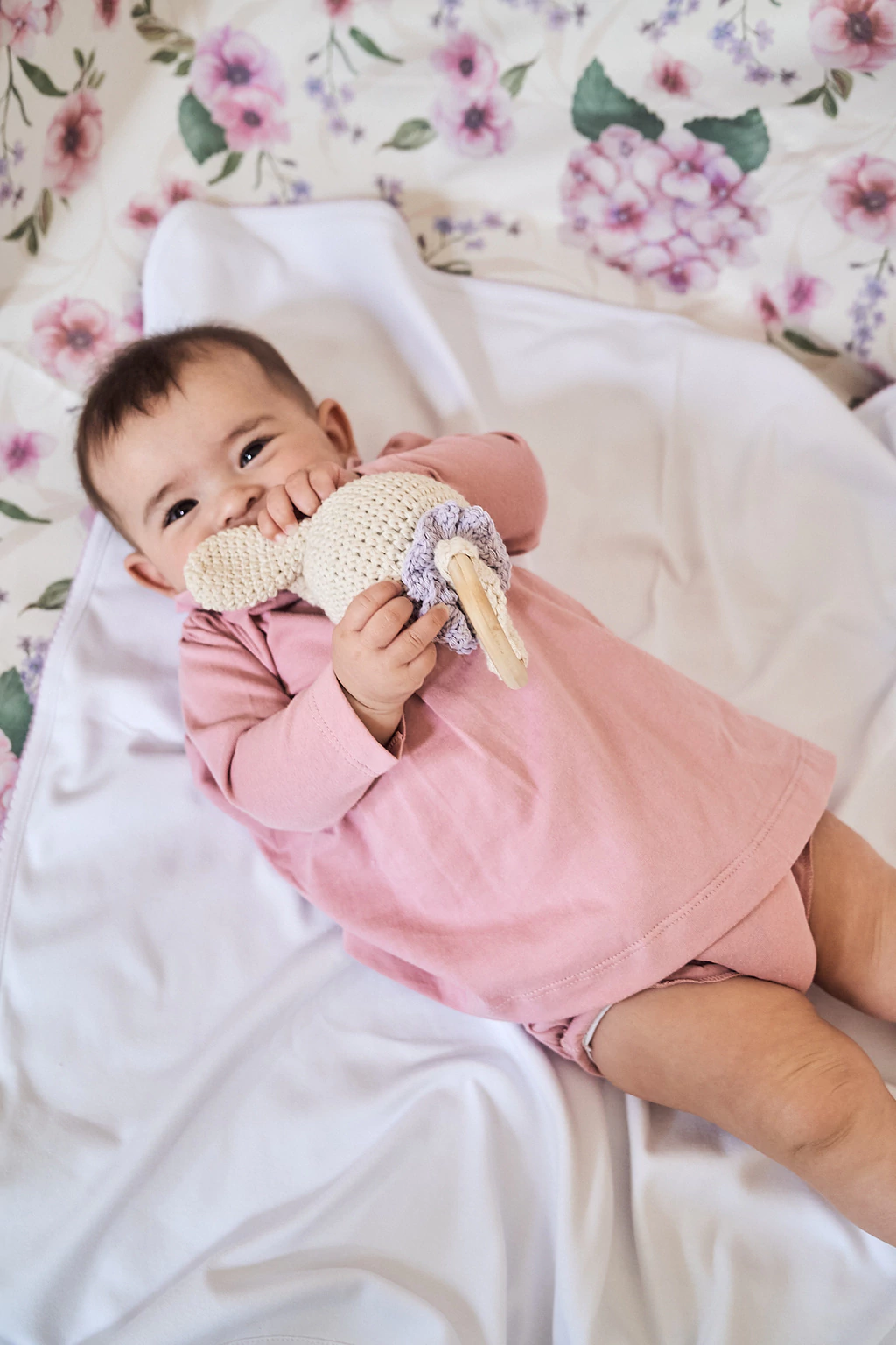 Cuidados: lavar a mano con jabón específico para bebés con ph neutro para cuidar la prenda y la piel del bebé.